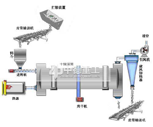 沙子由皮帶輸送機(jī)或斗式提升機(jī)送到料斗,然后經(jīng)料斗的加料機(jī)通過加料管道進(jìn)入加料端,加料管道的斜度要大于物料的自然傾角,以便物料順利流入干燥器內(nèi),烘干機(jī)的滾筒是一個(gè)與水平線略成傾斜的旋轉(zhuǎn)圓筒,河沙等物料從較高一端加入,載熱體由低端進(jìn)入,與物料成逆流接觸,也有載熱體和物料一起并流進(jìn)入筒體的。隨著圓筒的轉(zhuǎn)動(dòng)物料受重力作用運(yùn)行到較底的一端,濕物料在筒體內(nèi)向前移動(dòng)過程中,直接或間接得到了載熱體的給熱,使?jié)裎锪系靡院娓?,然后在出料端?jīng)皮帶輸送機(jī)送出。在轉(zhuǎn)筒內(nèi)壁上還裝有揚(yáng)料板,主要是在轉(zhuǎn)筒滾動(dòng)中將物料抄起再撒下,由此使?jié)窳喜灰渍辰Y(jié),充分與氣流接觸,得到效率高烘干。